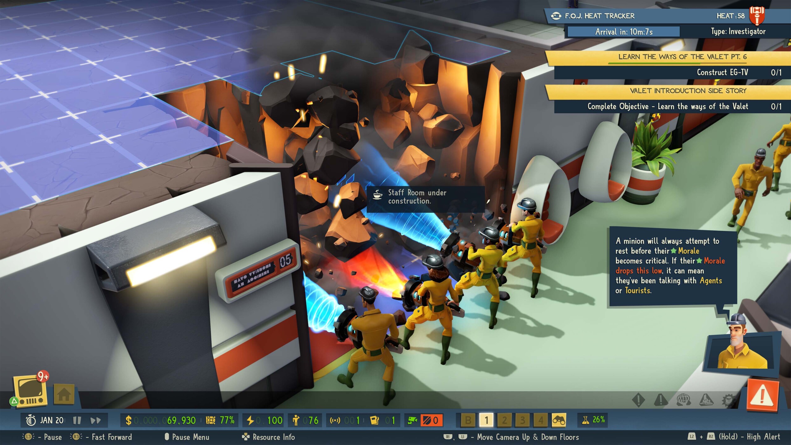 Nachdem ich das Spiel gekriegt habe, musste ich mich wie bei vielen spielen auf einen langweiligen Tutorial Modus einstellen. Am Ende zeigt dieser zwar wie das Spiel funktioniert, aber einen nicht wirklich weiter bringt. Bei Evil Genius 2 ist das anders, denn man beginnt direkt seine Basis aufzubauen.